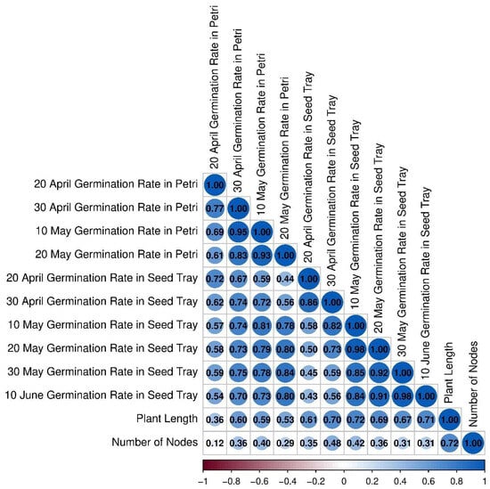 CLK cultivars were mostly clustered on the negative side of PC2 and were moderately associated with germination parameters. Similarly, RZS cultivars were positioned in the negative region of PC2. The strong positive relationship of 5BB cultivars with plant growth parameters (plant length and number of nodes) indicates their superior performance in terms of vegetative development. Overall, the PCA analysis effectively differentiated the cultivars and treatments based on their germination and seedling growth characteristics, revealing distinct grouping patterns. This multivariate approach provided a comprehensive evaluation of the interaction between rootstocks and performance traits, highlighting key genotypic responses across measured variables (Figure 2). Additionally, significant positive correlations were found among germination rates across different dates and conditions. The highest correlation was observed between 20 May and 30 May germination rates in seed trays (r = 0.94), followed by 10 May and 20 May germination rates in Petri dishes (r = 0.93) and 20 May and 30 April germination rates in Petri dishes (r = 0.83). Germination rates in seed trays showed strong correlations with each other (r = 0.73–0.94). Plant length was positively correlated with germination rates, ranging from r = 0.36 (20 April in Petri dishes) to r = 0.76 (10 June in seed trays).