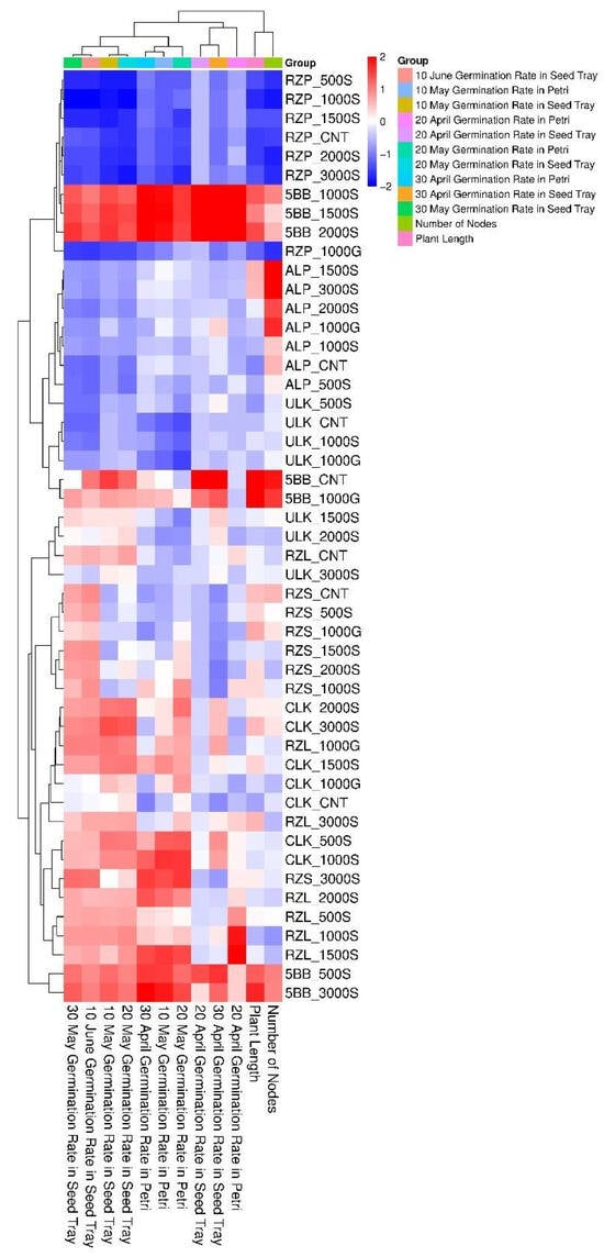 The number of nodes was moderately correlated with germination parameters (r = 0.12–0.48) and showed the strongest correlation with plant length (r = 0.72) (Figure 3). The heatmap analysis revealed distinct clustering patterns among SNP concentrations, cultivars, and measured parameters. Higher SNP concentrations (3000S) showed negative correlations with germination rates in RZP and ALP cultivars under seed-tray conditions (20–30 May), while moderate concentrations (1500S, 2000S) demonstrated positive associations with plant length and node numbers in ULK and 5BB cultivars. The 5BB samples exhibited consistently high germination performance across all dates and growing media, particularly 5BB_1000S, 5BB_1500S, and 5BB_2000S variants. Conversely, RZP samples displayed generally poor germination rates. ALP variants presented mixed results, with notable strength in 1500S and 3000S concentrations. Temporal patterns revealed that May germination rates were typically higher than April rates, with seed-tray germination outperforming Petri dish results. The 1000G treatments clustered with improved late-stage germination (30 May seed tray) in the ALP and RZP groups. Control groups formed a separate cluster, correlating with lower germination rates and reduced growth metrics. Cultivar-specific responses were observed, with ULK and 5BB demonstrating greater resilience to higher SNP levels than RZP or ALP (Figure 4).