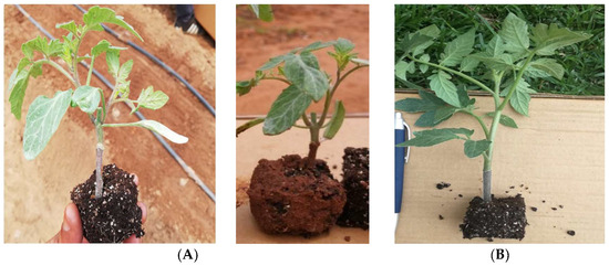 Grafting and non-grafting of indeterminate tomato seedlings using the splice grafting method were conducted at a commercial nursery (Multigrow Nursery, Brits, South Africa). Tomato seeds were sown in white peat moss (4 × 4 cm blocks) and covered with coco-peat after seeding. Scion seeds were planted a day after rootstock seeds. The seeds were placed in a germination room at 26.5 °C for 3 days. Thereafter, the seedlings were transferred to a greenhouse, where the temperature was 27 ± 1/17 ± 1 °C (day/night) at a relative humidity of 40/60% (day/night) for 15 days. The seedlings were then grafted and placed in a recovery room for 6 days at a temperature of 22–24 °C and a relative humidity of 56–58%. A fluorescent lamp with red–blue light was used as the light source. An SCX824 scion with two stems was performed at the grafting stage by removing/pinching the growing point shoot to allow two shoots to develop at the two cotyledons (Figure 1A), while in the single-scion treatment, the growing point was not removed (Figure 1B). The seedlings were moved from the recovery room into the greenhouse, separated by a spacing of 5 cm × 5 cm, and kept for 18 days before transplanting.
