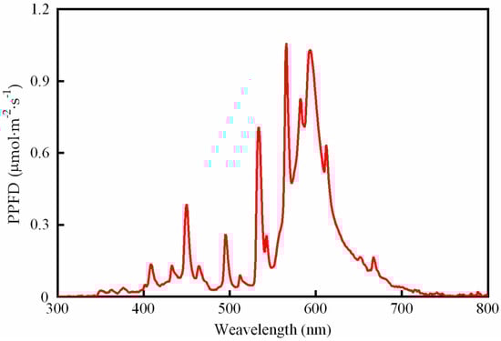 Tomato (Solanum lycopersicum Mill. cv. ‘Jingpeng No. 1’) seeds were surface-disinfected by soaking in 55 °C water for 15 min, followed by a 6–8 h soak in room-temperature water. Seeds were then incubated in a dark incubator (28 °C, 95% RH) for 72 h to promote germination, after which they were sown in 72-cell trays filled with a peat:vermiculite:perlite (3:1:1, v/v/v) seedling substrate. Seedlings were cultivated for 35 days in an illumination incubator (PRX-450C-30, Ningbo, China) under controlled conditions: 25 °C/18 °C day/night temperature, 250 µmol·m−2·s−1 PPFD [41], 70% RH, and a 14-h photoperiod. At the 4-leaf stage, they were transplanted into 20 cm (diameter) × 16 cm (height) plastic pots with commercial compost (Jiahui Co., Yangling, China). Artificial illumination was provided by metal halide lamps (HQI, 400 W; Osram Co., Munich, Germany), with spectral outputs validated using a calibrated spectroradiometer (Figure 1). Pure CO2 gas (99.9% purity; Shaanxi Meiqi Trading Co., Ltd., Yangling, China) was used for enrichment treatments.
