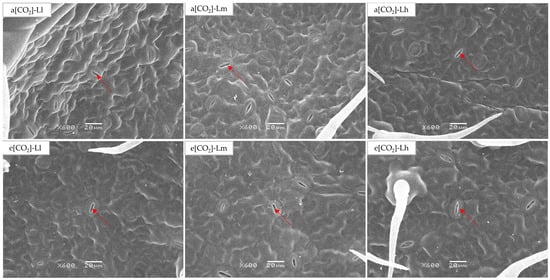 Stomatal structure in leaves of tomato seedlings under a factorial design of two CO2 levels and three PPFD treatments in growth chambers. The red arrows indicate the stoma.