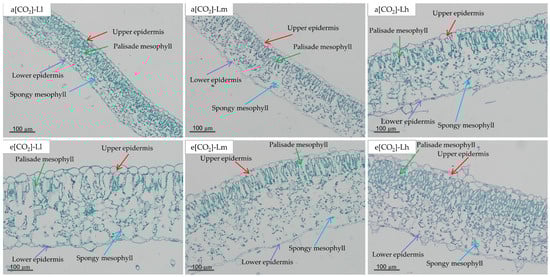 Leaf anatomical parameters responded significantly to [CO2], light intensity, and their interaction (p < 0.05; Table 2/Figure 4). Elevated [CO2] augmented palisade mesophyll (PM, +71. 07%), spongy mesophyll (SM, +86.94%), and epidermal thickness (upper, UE + 41.11%; lower, LE + 42.79%), collectively increasing total leaf thickness (LT) by 75.65% versus ambient [CO2]. The ratio of PM to SM (PM/SM) responded non-uniformly to e[CO2], increasing at low/high light (+1.92–10.71%) but decreasing at moderate light (−41.82%). Across both CO2 regimes, LT, SM, UE, and LE thicknesses increased with light intensity. Under ambient [CO2], PM/SM ratio increased linearly with light intensity, whereas e[CO2] induced nonlinear responses peaking at high light. The e[CO2]-Lh treatment yielded maximal LT, PM, UE, and PM/SM values.