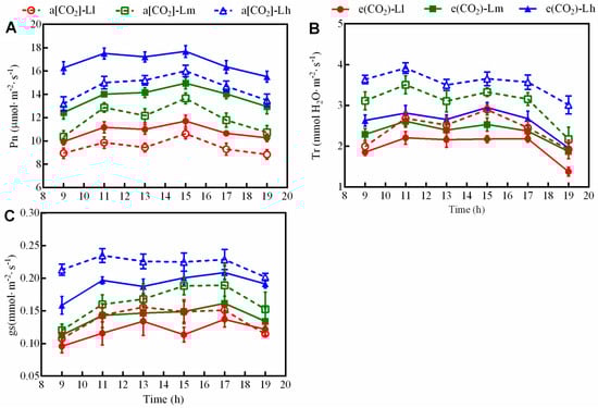 Diurnal gas exchange patterns—including Pn (A), Tr (B), and gs (C)—were monitored in tomato seedlings under a factorial design of two CO2 levels and three PPFD treatments in growth chambers. Data are shown as means ± SE (n = 5).