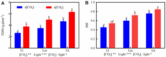 To evaluate the combined effects of e[CO2] and enhanced light intensity on seedling quality, TDM and SHI were measured (Figure 6). Both parameters were significantly influenced by [CO2], light intensity, and their interactions (p < 0.05–0.001), following parallel response trends. Specifically, e[CO2] increased TDM and SHI by 40.36% (Figure 6A) and 5.95% (Figure 6B) versus ambient [CO2]. Moderate and high light intensities further boosted TDM by 32.20% and 73.29%, and SHI by 31.66% and 64.96%, respectively, relative to low light. The e[CO2]-Lh treatment achieved the highest TDM (6.28 g·plant−1) and SHI (0.79), surpassing all other combinations. These results highlight synergistic benefits of e[CO2] and high light intensity in promoting biomass accumulation and seedling vigor, with e[CO2]-Lh representing an optimal strategy for controlled-environment tomato seedling production.