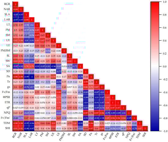 Pearson correlation analysis (Figure 7) revealed a near-perfect positive correlation between RGR and NAR (r = 0.99). Notably, both RGR and NAR were strongly negatively correlated with SLA (r = −0.95 to −0.97) and LAR (r = −0.97), indicating a trade-off between leaf expansion and carbon allocation efficiency. Moreover, PM and SM thicknesses showed strong positive correlations with total leaf thickness (LT; r = 0.85–0.95), supporting their combined role in optimizing light interception. Furthermore, UE thickness positively correlated with RGR (r = 0.82) and Pn (r = 0.98), suggesting that epidermal reinforcement enhances photosynthetic capacity through structural support. Pn positively correlated with stomatal dimensions (length [SL], r = 0.64; width [SW], r = 0.83) and growth metrics (RGR, r = 0.98; NAR, r = 0.98; TDM, r = 0.96; SHI, r = 0.97), thereby indicating that enlarged stomatal apertures facilitate CO2 diffusion and carbon assimilation. Conversely, SD weakly negatively correlated with Pn (r = −0.22), potentially reflecting a trade-off between gas exchange and water conservation under high vapor pressure deficit. In addition, chlorophyll fluorescence parameters showed Fv′/Fm′ strongly correlated with ETR (r = 0.94), while NPQ negatively correlated with SLA and LAR, suggesting enhanced photoprotection in low-SLA leaves. SHI robustly correlated with TDM (r = 0.87), Pn (r = 0.97), RGR (r = 0.91), and NAR (r = 0.92), thus indicating that e[CO2] and increased light intensity promote seedling vigor via enhanced carbon assimilation and biomass accumulation.