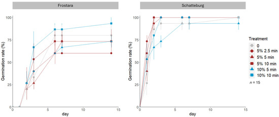 Germination speed of seeds of kale varieties Frostara (left) and Schatteburg (right) treated with different concentrations of NaClO (%) in different durations (min) for disinfection; seeds were germinated on filter paper in Petri dishes in a breeding room; n = 15, means ± SE (raw data in Table S2).