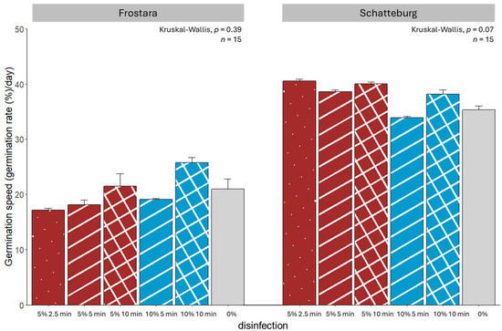 The germination rate of Frostara kale seeds in Petri dishes was highest in the treatment with 10% NaClO for 10 min, being 33% higher than in the 5%/2.5 min treatment, which had the lowest germination rate (60%) (Figure 1, raw data in Table S2). In Frostara, a 100% germination rate was not achieved in any of the treatments. In contrast, the germination rate of 80% of the Schatteburg treatments reached the maximum of 100% except for the 10%/5 min treatment, whose rate was 7% lower than the others. In Frostara, seeds with infections had a reduced germination rate and speed in the 5%/2.5 min treatment (Figure 1, Figure 2, Figure 3 and Figure 4).