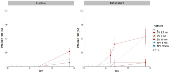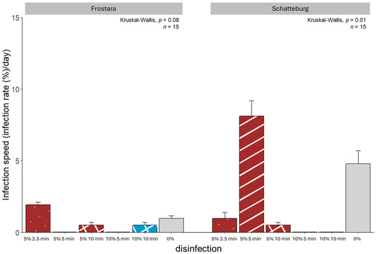 The maximum infection speed value that could be achieved in this study was 42.9 (IS = 1800%/14 days). Compared to Frostara, we determined higher infection speeds in Schatteburg treatments (Figure 4, raw data in Table S2). Here, the highest infection speed was achieved when treated 5 min with 5% NaClO, which was 8% higher (but not significant) than the lowest speeds in the 10%/5 min and 10%/10 min treatments. In contrast, the Frostara seeds had the highest infection speed when treated with 5%/2.5 min that was 2% higher (but not significant) than infection speed of both 10 min treatments.