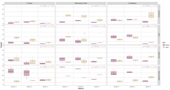 Leaf abscission. Leaf abscission occurred slightly more frequently on M2 compared to M1 (Figure S9). In a comparison of all media, it occurred most frequently on M3 (being significant in some cases) (Figures S9 and S10). Leaf abscission most frequently occurred again within Se and never within Ro and Hy (often significant). In Frostara, leaf abscission occurred significantly less frequently on average than in the other two varieties, with Schatteburg having the highest rate.