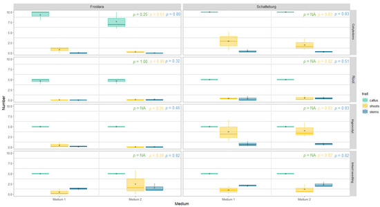 Number of regenerated calluses, shoots, and stems of micropropagated kale from different explant types grown on different media after eight weeks. Data represent mean ± SE of three independent boxes each containing five (for Schatteburg and Frostara) or three explants (for Oldenburger Palme), respectively (in the case of cotyledons, there were 10 or 6 replicates each, respectively) (deviations for Frostara M1 Ro: n = 4, Frostara M2 Co: n = 9). Kruskal–Wallis test, α = 0.05, NA = no stat. test possible, p-value colours correspond to the colours indicated in the legend (raw data in Table S3).