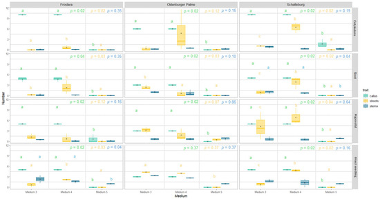 Formation of stems. The number of newly formed stems did not differ significantly between medium 1 and 2 for all three varieties (Figure 7, raw data in Table S3, photos in Figure S13). In medium 3, the number of new stems was in most cases slightly higher, but not significantly higher compared to medium 4 (Figure 8). The number of stems in medium 5 differed on average only slightly from the other media, even though, in contrast to the other media, M5 never produced more than one stem.