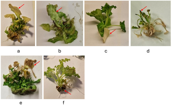 Phenotypic anomalies: (a) yellowing (sample Frostara M2 Se), (b) hyperhydricity (sample Schatteburg M2 Co), (c) albinism (sample Frostara M5 Se), (d) shoot tip necrosis (sample Schatteburg M1 Se) (e) leaf abscission (sample Schatteburg M2 Hy), (f) phenolic oxidation (sample Frostara M1 Se). The red arrows mark the respective anomalies.