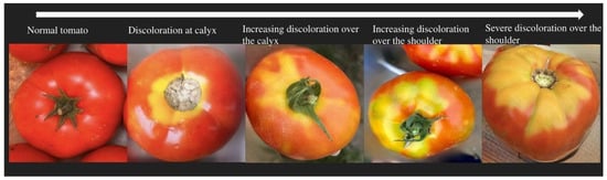 - Higgins, G.; Scheufele, S. Tomato, Physiological Ripening Disorders; University of Massachusetts Agriculture and Landscape Program: Amherst, MA, USA, 2019; Available online: https://ag.umass.edu/vegetable/fact-sheets/tomato-physiological-ripening-disorders (accessed on 17 December 2023).