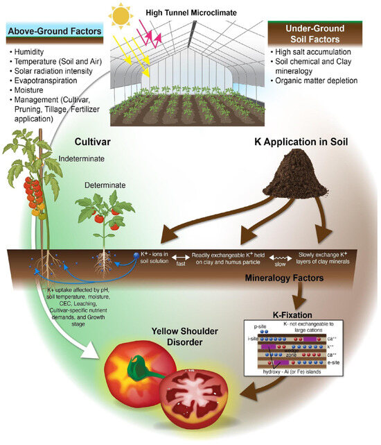 Further, the presence of other cations, Mg and Ca, has been observed to affect K fixation processes. High concentrations of these cations within the soil solution have the potential to engage in competition with K for the occupation of binding sites on soil colloids [74]. There is a need for work on how cation competition for binding sites affects K availability based on soil mineralogy, physicochemical characteristics, and soil moisture regime, particularly in HT soil [81,82]. This knowledge gap in HT systems could lead to better K fertilizer recommendations by understanding the impact of cation competition on K’s ability to prevent YSD and may need to be tailored to specific soil types, management practices, and tomato cultivars.