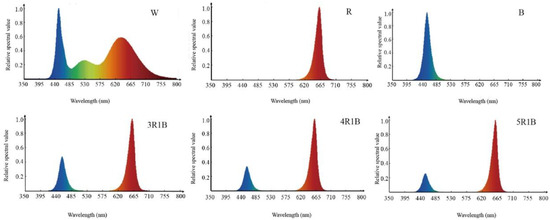 At the five-leaf-one-heart stage, healthy, pest-free celery seedlings were selected for transplantation into hydroponic systems. Six lighting treatments were set up: white (CK), red (R), blue (B), and 3R1B, 4R1B, and 5R1B ratios, using 18 W LED lamps (661 nm red, 442 nm blue). Each treatment maintained PPFD = 200 ± 10 μmol·m−2·s−1. Each treatment had 24 plants in 3 replicates, which were harvested after 45 days. Environmental conditions were as follows: 24 °C day, 18 °C night, 12 h light/dark cycle, 50% humidity, 1/2 Hoagland’s nutrient solution (pH 6.5 ± 0.5, EC 2 ± 0.5 mS·cm−1), replaced every 15 days, with continuous oxygen supply. Figure 1 shows the spectral distributions.