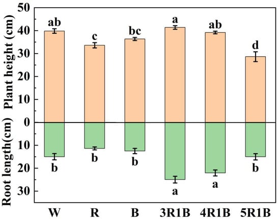 Effect of different light quality treatments on celery growth. W (white light), R (red light), B (blue light), 3R1B (red light/blue light = 3:1), 4R1B (red light/blue light = 4:1), and 5R1B (red light/blue light = 5:1). Values labeled with different letters in the graph are significantly different (p < 0.05).