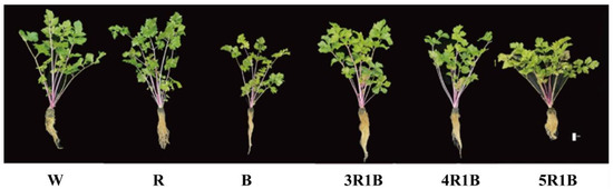 Light serves as a pivotal regulatory factor during the plant growth, with its varying spectral components (light quality) exerting significant and profound impacts on plant growth rate, developmental stages, and morphological architecture. It has been reported that exposure to red and blue light can promote the growth of lettuce [39]. When the light intensity was 240 and 300 μmol·m−2·s−1, compared to the 1R:1B treatment, the 2R:1B treatment increased the biomass of shoots and roots [40]. Red light conditions have a positive effect on the plant response of seedlings [41]. In this study, the plant height, root length, and aboveground and root fresh weight of celery were highest under the 3R1B treatment. They were reduced under the separate red or blue light treatments. This indicates that an appropriate proportion of red and blue light has a positive effect on the growth and development of plants, increasing the biomass of both aboveground and belowground parts and promoting the morphogenesis of the plants.