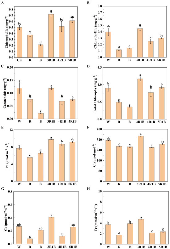 Effects of different light quality treatments on photosynthetic pigment content and photosynthetic gas exchange parameters of celery. (A) Chlorophyll a, (B) chlorophyll b, (C) carotenoids, (D) total chlorophyll, (E) net photosynthetic rate (Pn), (F) intercellular CO2 concentration (Ci), (G) stomatal conductance (Gs), (H) transpiration rate (Tr). Values labeled with different letters in the graph are significantly different (p < 0.05).