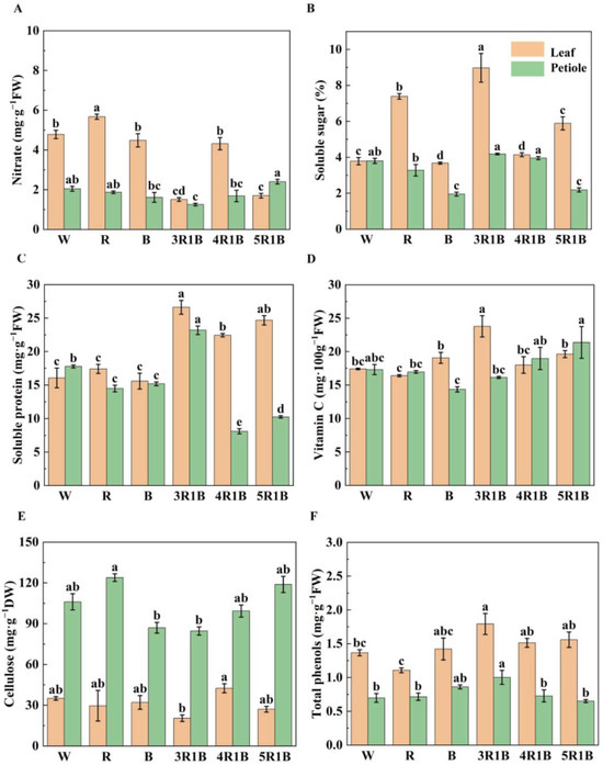 Effects of different light quality treatments on quality of celery. (A) Nitrate, (B) soluble sugar, (C) soluble protein, (D) vitamin C, (E) cellulose, (F) total phenolics. Values labeled with different letters in the graph are significantly different (p < 0.05).