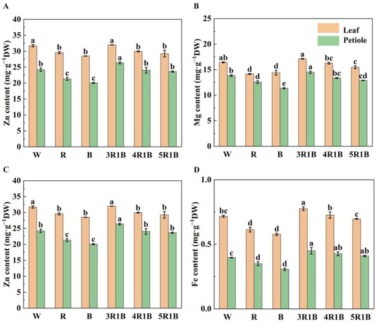 The contents of Ca (A), Mg (B), Zn (C), and Fe (D) in celery leaves and petioles under different light quality treatments. Values labeled with different letters in the graph are significantly different (p < 0.05).