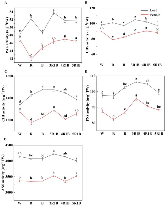 Changes in enzyme activity related to flavonoid synthesis of celery under different light quality treatments. (A) Phenylalanine deaminase PAL, (B) chalcone synthase CHS, (C) chalcone synthase CHS, (D) flavonoid synthase FNS, (E) anthocyanin synthase ANS. Values labeled with different letters in the graph are significantly different (p < 0.05).