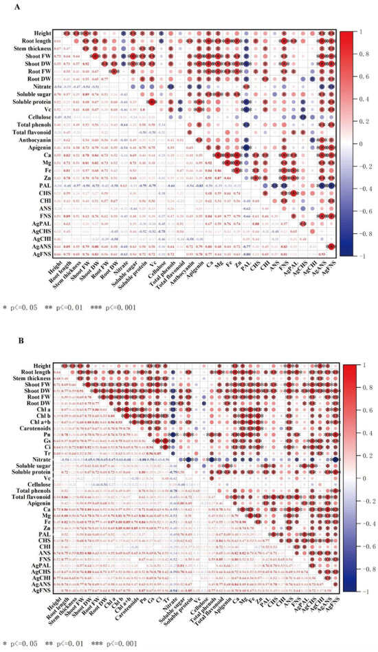 In order to gain insight into the relationship between the different light quality treatments of celery leaves and petioles and the photosynthetic characteristics and nutritional quality variables of celery, a correlation analysis was performed. The results (Figure 10) indicated that plant height and aboveground fresh weight of the celery leaves showed a significant positive correlation with aboveground dry weight, intercellular CO2 concentration, transpiration rate, total flavonoids, Ca, Mg, and ANS. Apigenin showed a significant positive correlation with soluble sugar, soluble protein, chlorophyll a, belowground fresh weight, belowground dry weight, PAL, CHS, and ANS. Total flavonoid content showed a positive correlation with soluble protein, soluble sugar, PAL, CHS, CHI, ANS, and FNS. Apigenin in celery petioles showed a positive correlation with soluble sugars, soluble proteins, vitamin C, total phenols, and anthocyanins, and anthocyanins were significantly and positively correlated with apigenin, nitrate, and PAL. In addition, there were also correlations among many other indicators; for example, apigenin was positively correlated with total flavonoids and negatively correlated with cellulose.