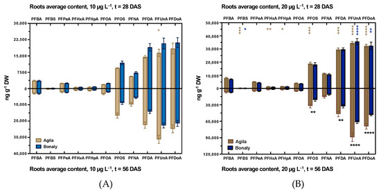 PFAS concentrations quantified in Agila and Bonaly lettuce roots at two plant ages (28 and 56 DAS) exposed to two PFAS concentrations of 10 (A) and 20 (B) µg L−1. Values are reported as mean ± standard error (n = 5). Black asterisks (*) indicate statistically significant differences between varieties, while colored asterisks denote significant differences between plant ages within the same variety. Symbols *, **, ***, and **** indicate significant difference at p levels of 0.05, 0.01, 0.001, and 0.0001, respectively.