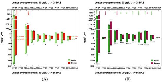 As for the roots, PFBS was generally undetectable under most conditions (<LOQ), except at 20 µg L−1 after 56 DAS, where its concentrations were 47 ng g−1 DW in Agila and 26.7 ng g−1 DW in Bonaly (Figure 3B).