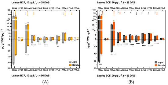 Bioconcentration factor (BCF) values of PFAS calculated for Agila and Bonaly lettuce leaves at two plant ages (28 and 56 DAS) exposed to two PFAS concentrations of 10 (A) and 20 (B) µg L−1. Values are reported as mean ± standard error (n = 5). Black asterisks (*) indicate statistically significant differences between varieties, while colored asterisks denote significant differences between plant ages within the same variety. Symbols *, **, ***, and **** indicate significant difference at p levels of 0.05, 0.01, 0.001, and 0.0001, respectively. ‘NC’ indicates not computable values.
