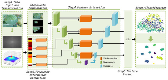 Figure 1, the framework of the method adopted in this study mainly includes the following parts: data input and transformation (step 1), data augmentation (step 2), frequency information extraction (step 3), feature extraction based on FA-Unet (step 4), feature fusion (step 5), and disease classification (step 6).