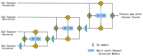 Four different scales of feature maps are sequentially fused through the AFF4 module. In this mechanism, the feature maps from smaller scales are up-sampled to restore spatial resolution, addressing cross-scale feature propagation. These up-sampled features then pass through the AFF module for multi-scale fusion. The fused feature maps repeat this process and further integrate with higher-scale features.