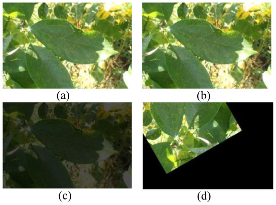Figure 5b–d display the same image after Gaussian filtering, brightness adjustment, rotation, and scaling.