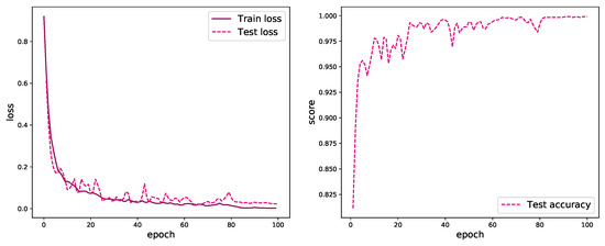 Figure 6. After 100 epochs of training, the proposed model successfully classified and identified various types of fruit leaf diseases. The model achieved an accuracy of 99.91% on the test set, with a loss of approximately 0.002. Notably, the model surpassed 99% accuracy around the 20th epoch, indicating strong convergence and stability throughout the training process.