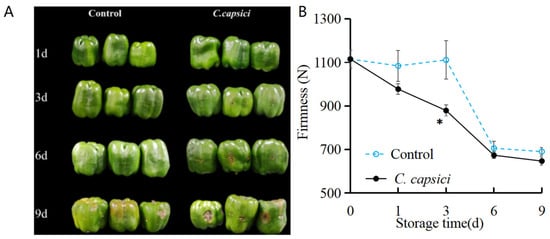 Effect of C. capsici infestation on the quality of appearance (A) and firmness (B) of peppers. The asterisks represent the significant difference (* p < 0.05) between C. capsici-treated peppers and control peppers on each storage day (the same applies below).
