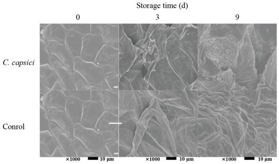 As the first barrier against the invasion of pathogenic bacteria, the cell wall plays an important role in protecting the cells from pathogenic bacteria. The microstructures of pepper epidermis on C. capsici treatment and control were observed. As can be seen in Figure 2, intact cell structure was observed in both the C. capsici treatment and control at 0 d. Distinct differences can be detected in the C. capsici treatment and the control during the subsequent period. In the control group, the degree of cell crumpling deepened with increased storage time. In contrast, rupture of pepper cells was observed at 3 d of storage in the C. capsici treatment group, and even a large number of anthracnose spores were enriched on the surface of the pepper epidermis at 9 d. These observations indicated that, under the tested conditions, C. capsici infestation accelerated tissue deterioration and led to substantial cellular disruption in peppers, which was consistent with the disease development shown in Figure 1.