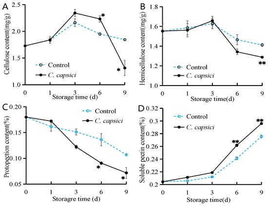 Effects of C. capsici infection on cellulose content (A), hemicellulose content (B), protopectin content (C), and soluble pectin content (D) of peppers. The asterisks represent the significant difference (* p < 0.05, ** p < 0.01) between C. capsici-treated peppers and control peppers on each storage day.