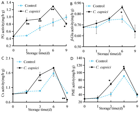Effects of C. capsici infection on PG activity (A), β-Glu activity (B), Cx activity (C), and PME activity (D) of peppers. The asterisks represent the significant difference (* p < 0.05, ** p < 0.01) between C. capsici-treated peppers and control peppers on each storage day.