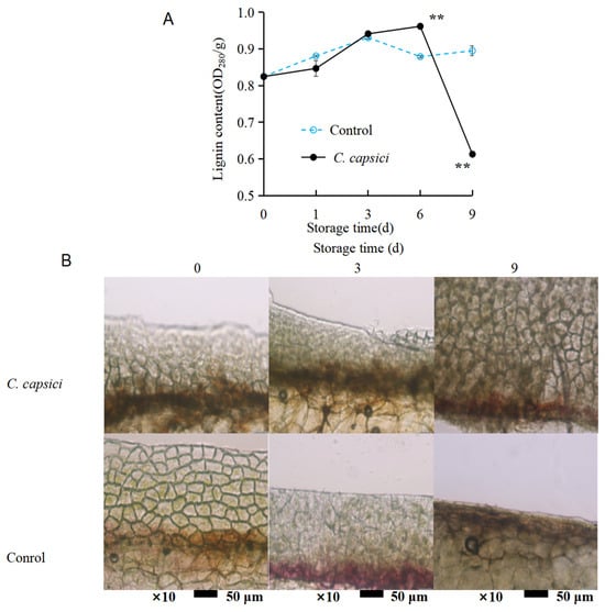 Effects of C. capsici infection on lignin content (A) and lignin deposition (B) of peppers. The asterisks represent the significant difference (** p < 0.01) between C. capsici-treated peppers and control peppers on each storage day.