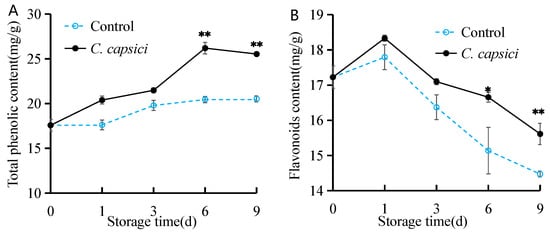 Effect of C. capsici on total phenolic content (A) and flavonoid content (B). The asterisks represent the significant difference (* p < 0.05, ** p < 0.01) between C. capsici-treated peppers and control peppers on each storage day.