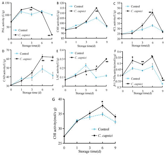 Effects of C. capsici infection on PAL activity (A), C4H activity (B), 4CL activity (C), CAD activity (D), LAC activity (E), β-1,3-Glu activity (F), and CHI activity (G) of peppers. The asterisks represent the significant difference (* p < 0.05, ** p < 0.01) between C. capsici-treated peppers and control peppers on each storage day. PAL, Phenylalanine ammonia-lyase; C4H, Cinnamic acid-4-hydroxylase; 4CL, 4-coumaric acid CoA ligase; CAD, Cinnamyl alcohol dehydrogenase; LAC, Laccases; β-1,3-Glu, β-1,3-glucanase; CHI, Chitinase.