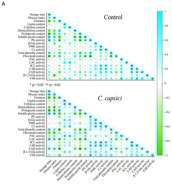 As shown in Figure 8A, storage time exhibited a significant or highly significant positive correlation with total phenolic content (p < 0.05) and soluble pectin content (p < 0.01) while showing a negative correlation with firmness (p < 0.01) and protopectin content (p < 0.01). These correlations suggest that, over time, the degradation of structural polysaccharides such as protopectin into soluble pectin contributes to fruit softening, while the accumulation of phenolic compounds likely reflects an induced defense response. In the C. capsici group, the storage time was positively correlated with disease index (p < 0.01). Disease progression following C. capsici infestation was closely tied to changes in cell wall metabolism and phenylpropanoid metabolism. For instance, the disease index showed a significant negative correlation with firmness, hemicellulose content, protopectin content, and flavonoid content (all p < 0.05), suggesting that C. capsici infection weakens the structural components of the cell wall and suppresses the biosynthesis or stability of flavonoids, which are known to have antimicrobial properties. In contrast, it was positively correlated with soluble pectin content (p < 0.01) and LAC and CAD activity (both p < 0.05), enzymes involved in lignin biosynthesis. This indicates that as the disease advances, cell wall disassembly is accompanied by attempts to reinforce cell walls via lignification as part of the host defense. Additionally, the firmness of pepper fruit was positively associated with structural cell wall components, particularly protopectin (p < 0.01). Interestingly, firmness was negatively correlated with cell wall polysaccharide depolymerization and disease index, as evidenced by increased PG and CAD activity, and increased total phenolic content. This pattern suggests a causal chain wherein C. capsici infection induces defense responses—including the activation of phenylpropanoid metabolism and lignification—but at the cost of accelerating cell wall disassembly and fruit softening.