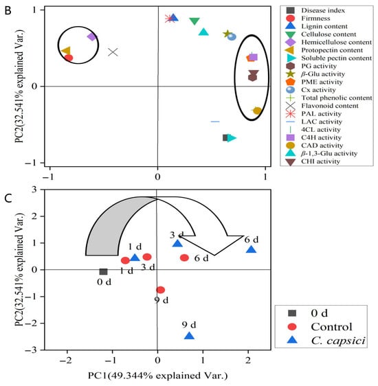 The score plot (Figure 8C) showed that, over the course of storage, the trend shifted from the positive axis of PC2 to the negative axis. In combination with the loading plot, this indicated a decrease in lignin content, flavonoid content, PAL activity, β-1,3-Glu activity, CHI activity, 4CL activity, and C4H activity, while the disease index increased. In contrast to the control group, C. capsici accelerated this trend. Additionally, a shift from the negative axis to positive axis of PC1 was observed, suggesting increased PG activity, PME activity, Cx activity, and β-Glu activity, alongside a reduction in firmness. Similarly, C. capsici stimulated this change.