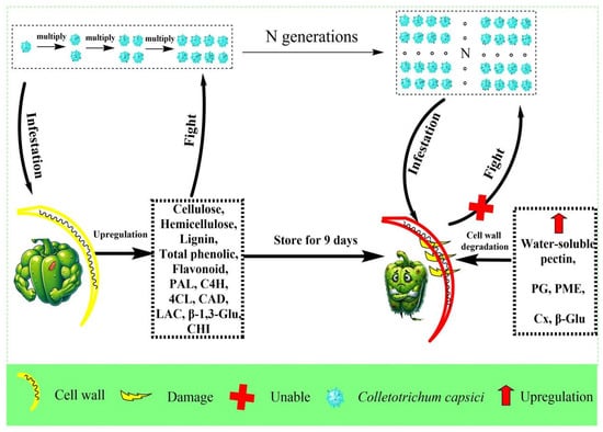 The variations in cell wall composites are correlated with the interaction of cell wall metabolism-related enzymes. Cell wall-degrading enzymes, such as polygalacturonase (PG), pectin methylesterase (PME), β-glucosidase (β-Glu), and cellulase, contribute to the decomposition of cell wall polysaccharides, leading to the loss of integrity of the middle layer of the cell wall and of cellular toughness, which induces softening of the fruits and the loss of resistance to disease, which, in turn, facilitates the infestation of pathogenic bacteria [36,43]. In this study, we found that C. capsici infestation effectively increased the activities of PG, PME, β-Glu, and Cx but dramatically dropped after the sixth day (Figure 4). These results are similar to the responses observed in grape [43], longan [38], and Valencia orange [42] following pathogen infestation. Our results, although indicating an increase in cell wall-degrading enzyme activities and a decrease in fruit firmness, notably show that the content of cell wall components remains relatively high. This could be explained by the fact that, under stress responses (biotic or abiotic stress), the activity of cell wall-degrading enzymes increases, but the cell wall components are reinforced through various pathways to maintain the defense mechanism of the cell wall [44,45].
