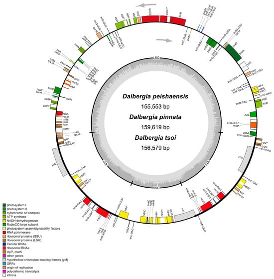 Chloroplast genome maps of Dalbergia peishaensis, D. tsoi, and D. pinnata. The arrows represent the transcriptional direction of genes and * represent the multiple copy genes.
