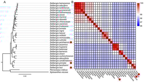 A phylogenetic tree obtained using the maximum likelihood (ML) method for Dalbergia species based on whole plastid genomes and their average nucleotide identity (ANI). The red solid circles represent the three tropical Dalbergia species. (A) The evolutionary tree of 29 Dalbergia species; P. indicus and S. viscosa were set as outgroups. (B) ANI analysis between 29 Dalbergia species.