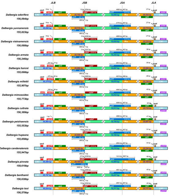 - Li, C.; Liu, Y.; Lin, F.; Zheng, Y.; Huang, P. Characterization of the complete chloroplast genome sequences of six Dalbergia species and its comparative analysis in the subfamily of Papilionoideae (Fabaceae). PeerJ 2022, 10, e13570. [Google Scholar] [CrossRef]