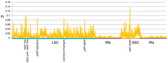 Highly variable sequences were calculated using DNASP version 6 with the window length and step size set as 100 and 25 bp, respectively (Figure 6). The divergent hotspot region in the plastid genome of Dalbergia was mainly distributed in the LSC and SSC regions. The nucleotide diversity (Pi) values ranged from 0.00143 to 0.13791. Six variable hotspots (Pi > 0.08) were detected, namely trnL-UAA, trnL-UAA—trnT-UGU, trnS-UGA—psbC, trnR-UCU—trnG-UCC, psbB—psbT, and ndhG—ndhI, of which five hotspots were located in the LSC region and one hotspot was distributed in the SSC region, and only the region between ndhG and ndhI was identified as being of high variation (Pi > 0.1).