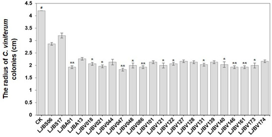 The antagonistic effects of these Bacillus strains against C. viniferum ‘82A11’ were evaluated using dual-culture plate assays. Overall, a significant proportion of the LJBV strains exhibited strong antagonistic activity, with partial LJBA strains also demonstrating notable inhibition. In contrast, LJBS and LJBM strains showed weaker antifungal efficacy (Figure S1). LJBS06 and LJBS17 with poor antagonistic effects were selected as negative controls, and the top 20 strains with the best antagonistic effects were further confirmed. Compared with CK (4.20 cm), LJBS06 (2.84 cm), and LJBS17 (3.19 cm), strain LJBV047 exhibited the strongest inhibition effect with a Colletotrichum colony growth radius of 1.81 cm, followed by LJBA01 (1.91 cm) (Figure 1, Table S1).