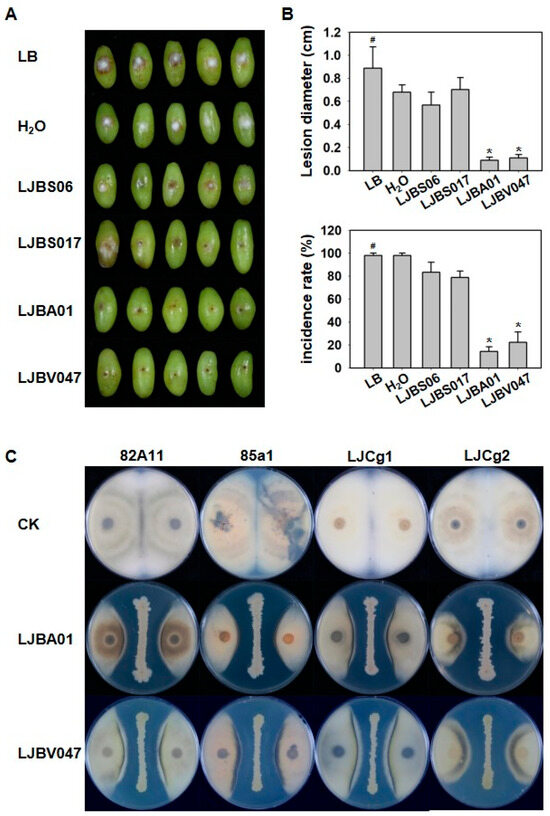 Bacillus strains LJBA01 and LJBV047 exhibit significant inhibitory effects on ripe rot. (A,B) LJBA01 and LJBV047 significantly reduced ripe rot incidence on Vitis vinifera ‘Centennial Seedless’ grape berries. Using LB and sterile water as controls, phenotypic evaluation of ripe rot resistance of Bacillus strains was conducted on Vitis vinifera ‘Centennial Seedless’ grape berries (A). Disease incidence and lesion diameter were statistically analyzed (B). Significance stars were from the Kruskal–Wallis H test (#, control; * p < 0.05). Each treatment included three biological replicates, with 10 grape berries per replicate. (C). Determination of the antimicrobial spectrum of LJBA01 and LJBV047. LJBA01 or LJBV047 were subjected to dual-culture assays with four distinct Colletotrichum strains (‘82A11’, ‘85a1’, ‘LJCg1’, and ‘LJCg2’). Phenotypes were observed to assess their inhibitory effects.