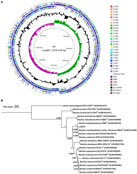 LJBA01 was identified as Bacillus amyloliquefaciens. (A) Genomic circle diagram of LJBA01. The LJBA01 genome consists of a single circular chromosome. From the innermost to the outermost, the 1st circle represents the scale marks of the genome, the 2nd circle represents the GC skew (green positive skew; purple, negative skew), and the 3rd circle represents the G + C content. The 4th and 7th circles indicate reverse and forward COG annotated coding sequences, respectively. The 5th and 6th circles represent reverse and forward CDSs, respectively. Very short features were enlarged to enhance visibility. Clustered genes, such as several rRNA genes, may appear as one line due to space limitations. (B) A phylogenetic tree of LJBA01 was constructed based on genomic sequences. The type strain Listeria monocytogenes NCTC10357T (GCM10015315) was used as the outgroup. The phylogenetic tree was constructed using the Maximum Likelihood (ML) method. The robustness for individual branches was estimated by bootstrapping with 1000 replications. ‘T’ indicates type strains. The scale bar indicates 0.03 nucleotide substitutions per site.